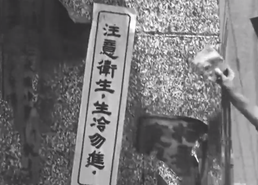 三毛喝浆糊被贴标语的人阻止,他指着墙上的标语训斥三毛:注意卫生,生冷勿进。