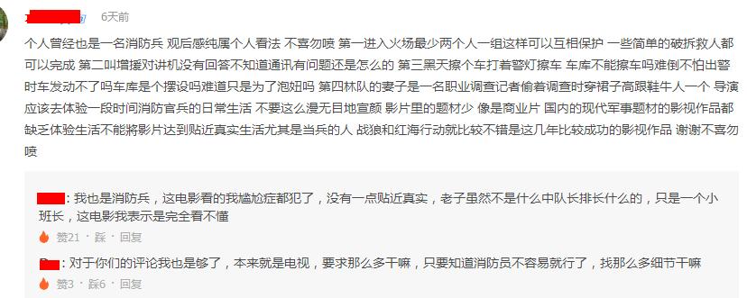 更是有不少消防战士建议先去体验了消防生活再来拍电影,并罗列出多个电影细节,看的尴尬症都犯了。当然也有网友称就是一部电影,要求那么多干什么,只要知道消防员不容易就行了,找那么多细节干嘛!