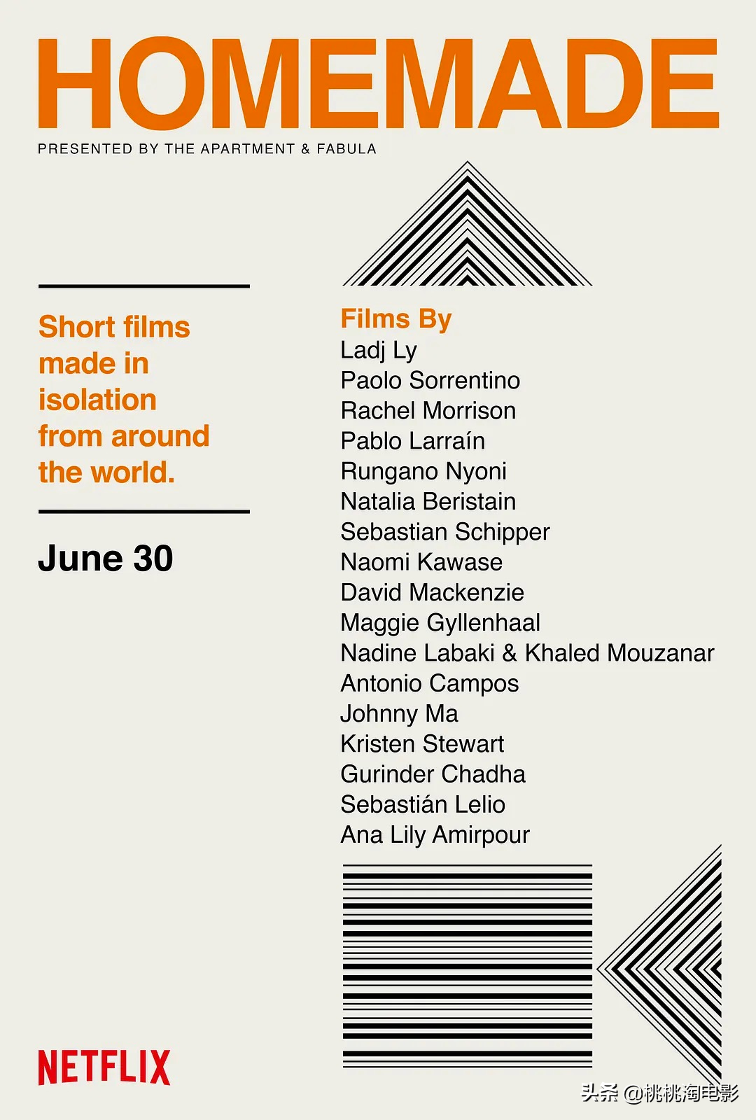 感受下上面的阵容,导演包括保罗·索伦蒂诺、克里斯汀·斯图尔特、玛吉·吉伦哈尔、拉吉·利、纳迪·拉巴基 、河濑直美、大卫·马肯兹、安娜·莉莉·阿米普尔、帕布罗·拉雷恩、马楠等等,他们都带来各自的居家短片,这样的阵容,真的很厉害了。