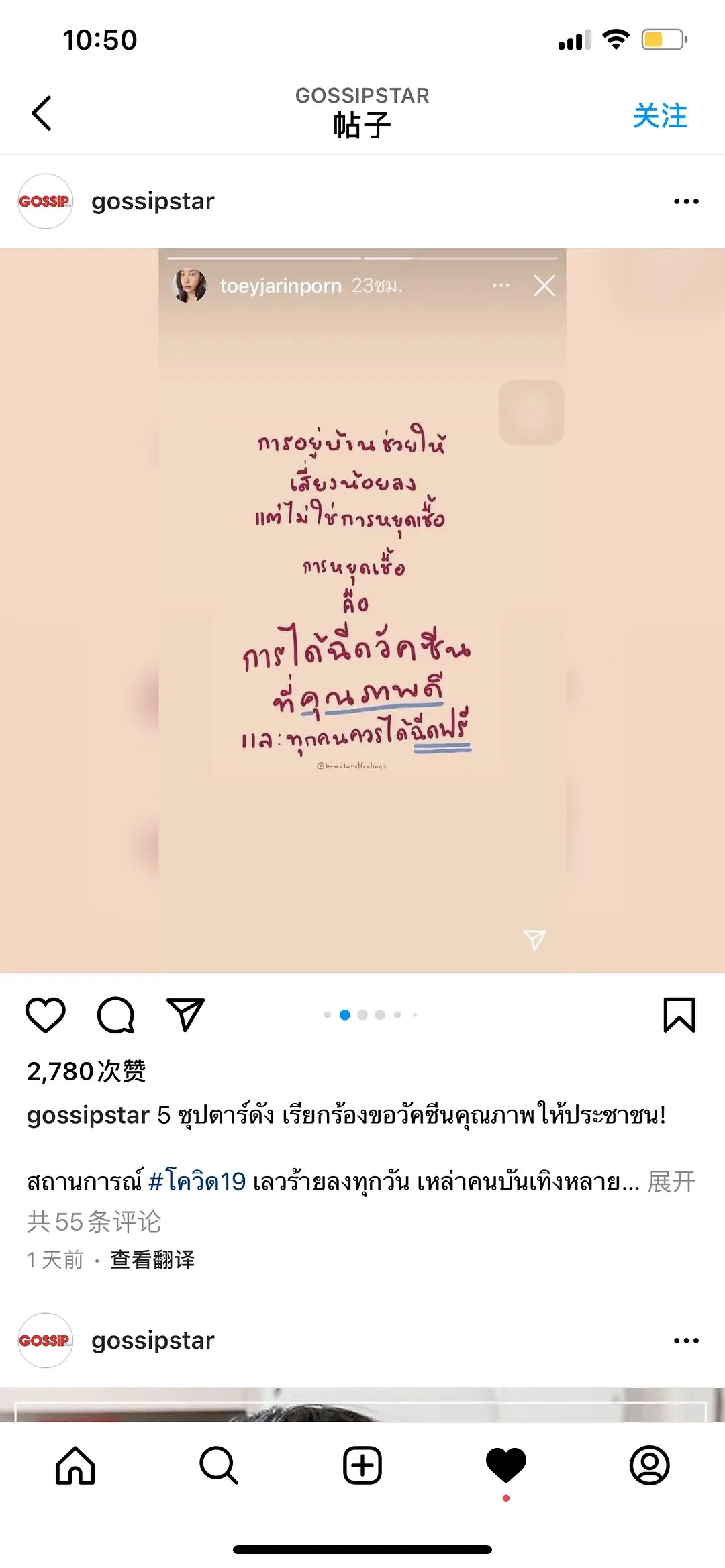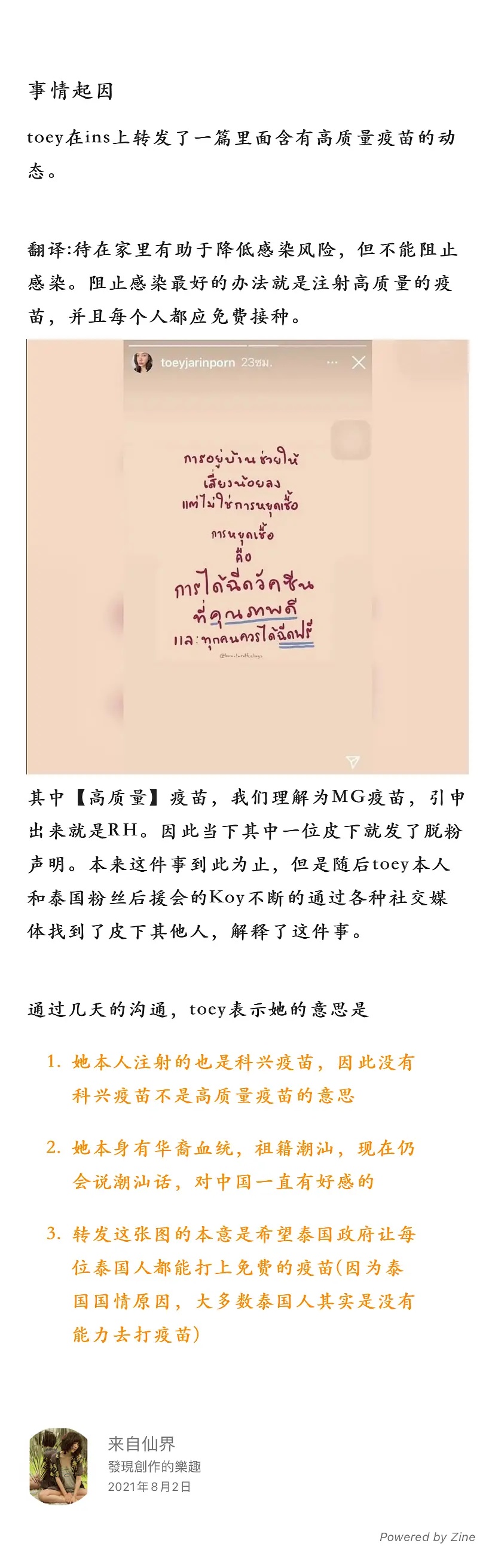 今年toey 为疫苗发声要求政府免费发放高端疫苗而被不少中国粉丝攻击