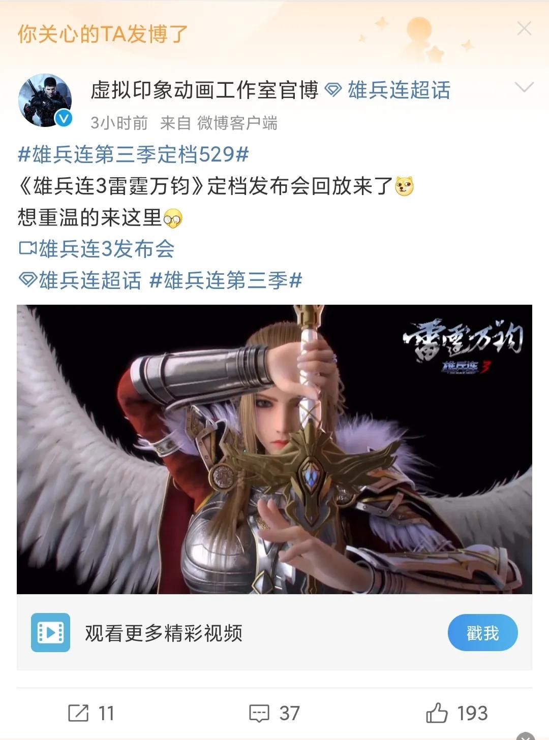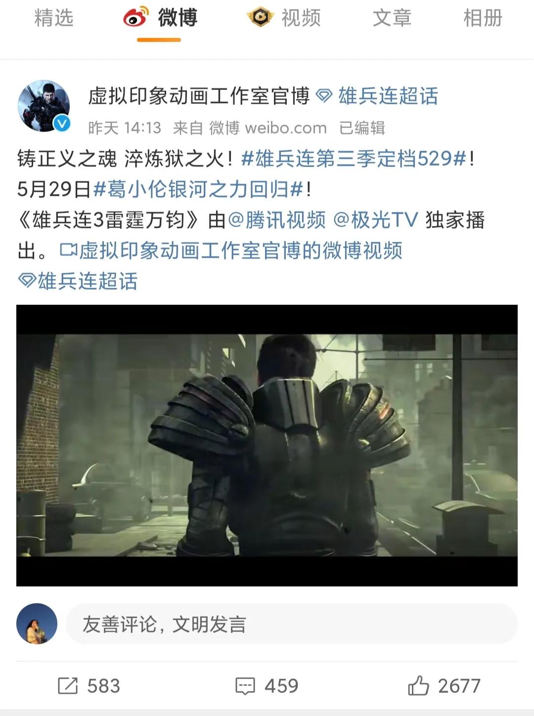 前晚虚拟印象正式发文,咱们等了n年的《雄兵连3》终于正式定档5.29;在腾讯视频以及极光tv独家播出。