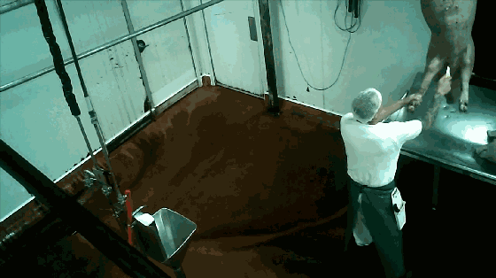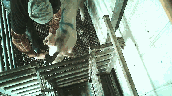 在几乎清醒的状态下,看到自己的同类被倒吊着,割喉、放血,甚至是仅仅闻到地板上同类的血腥味,很多猪都会吓得往后缩。