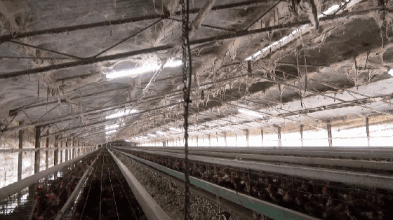 纪录片中出现了大量的特写和全景镜头,在那些现代化流水线式的厂房里,所有的生命被放置在拥挤的牢笼中,这里俨然就是——