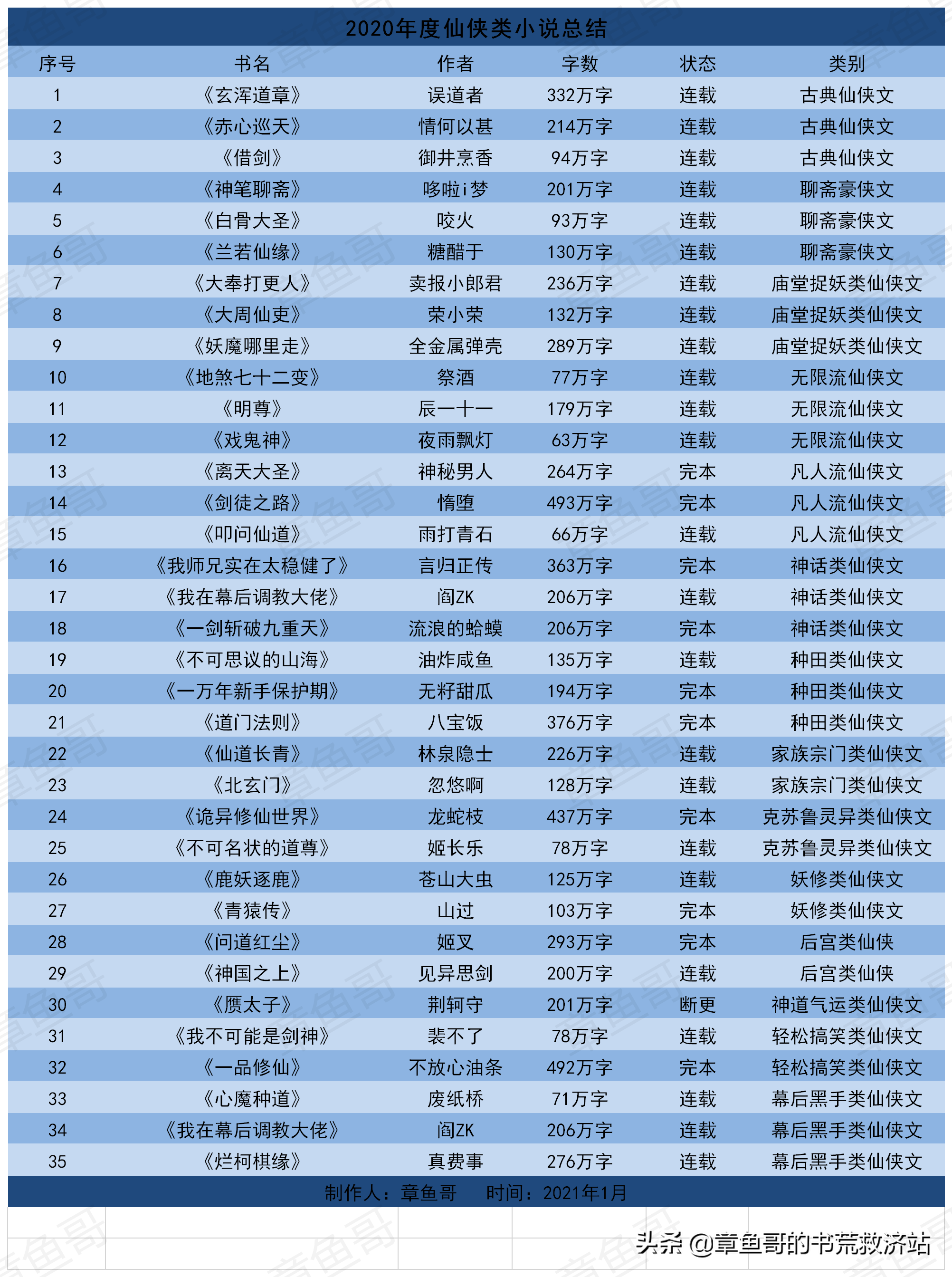 最后附上2020年度仙侠类小说一览表,排名不分先后: