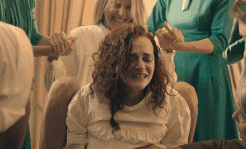 使女生产时,主教太太也得躺床上,表演疼痛和发力。