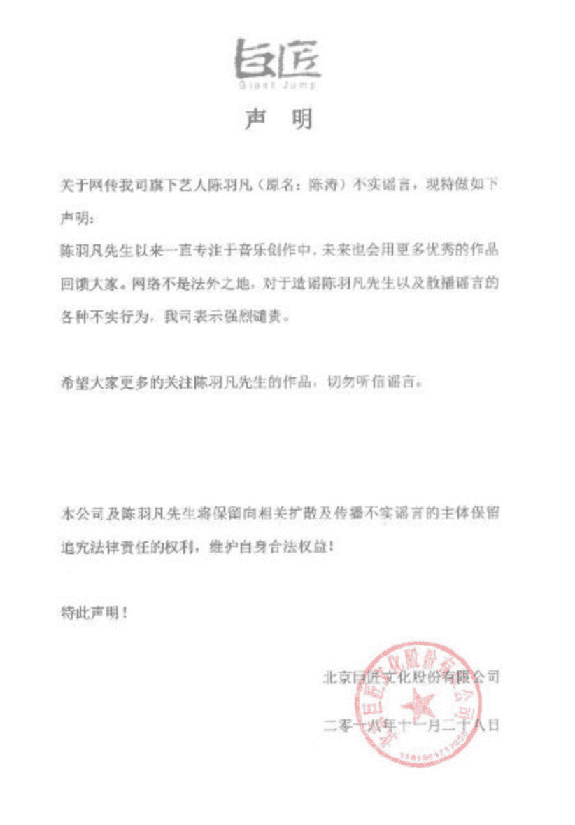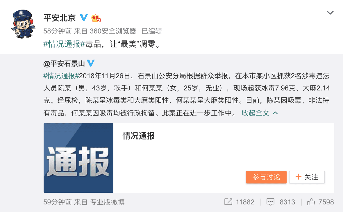 而随后北京警方的微博再次转发这条消息配文:毒品,让“最美”凋零。暗示这位陈某就是羽泉组合的陈羽凡。而网友发现,陈羽凡的工作室已经否认的微博,似乎已经默认了被抓的事实。