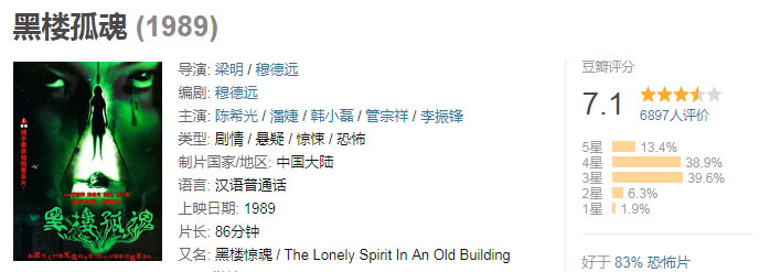 12、《黑楼孤魂》,中国电影史上最恐怖的一部电影,影片讲述了录音师和女演员在一座即将拆除的旧楼里收音,发生的一系列诡异事件。长长的走廊,走廊的尽头一个红门房子,房子里吊死了一个女孩,女孩变成鬼报仇的故事,电影画面构图大胆,配合音效特别的阴森恐怖,剧情贴近生活,导演非常敢拍,可以说现在没有人能拍出这样的影片了。据说,当年在北京大华影院上映时吓死过一位高龄观众,而被禁播。可想而知有多恐怖,现在看依然觉得后背凉飕飕的,是给观众带来压抑内心的恐惧感,绝不是靠音效一惊一乍的吓唬人。可能是受限于当时的特效,结尾处的鬼形象现在看有点low了,但是前面还是很恐怖的。