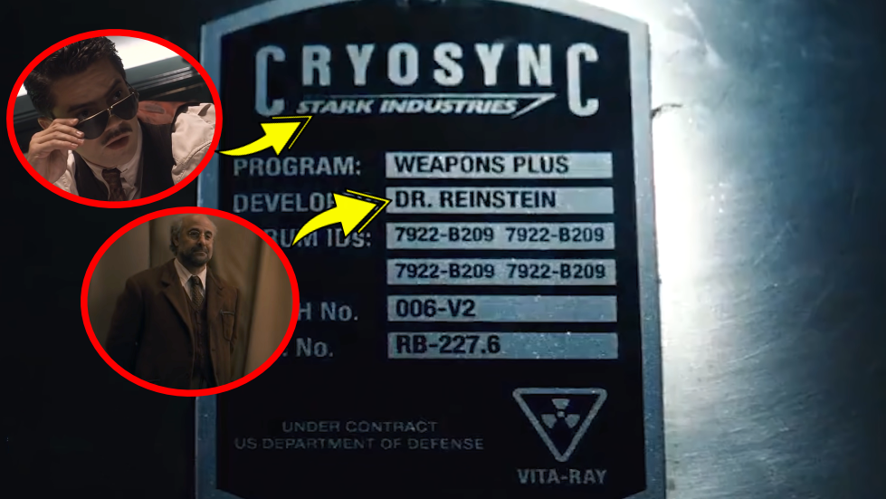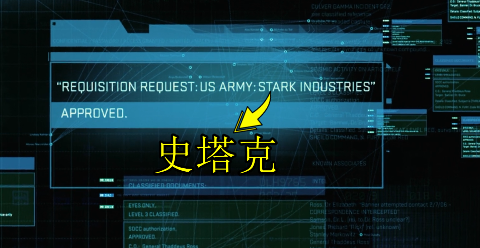 《无敌浩克》中还有一个与美队超级士兵血清有关的线索,电影44分30秒的镜头中,罗斯将军打开了装有神秘血清的容器,当我们将容器上的标签放大后就可以看到一个“dr reinstein”的名字,翻译过来就是“雷恩斯坦博士”,实际上,“雷恩斯坦”正是美国队长中“亚伯拉罕·厄斯金”博士的别名,在《美国队长》中,厄斯金博士就是美队使用的超级士兵血清的研发者。另外,在标签中,我们还可以看到另一个参与者“霍华德·史塔克”!