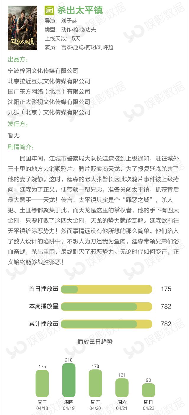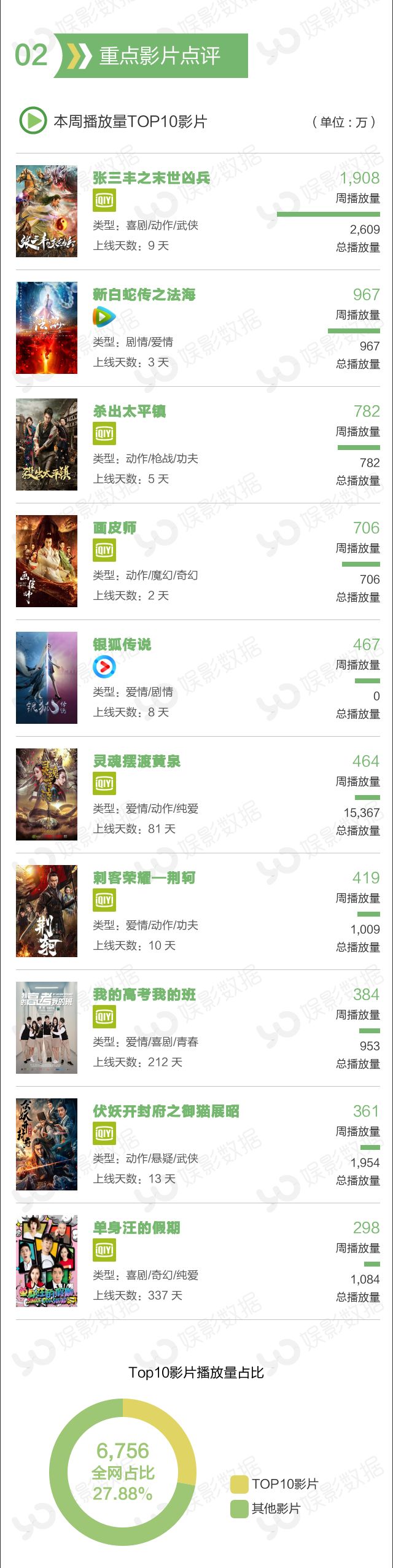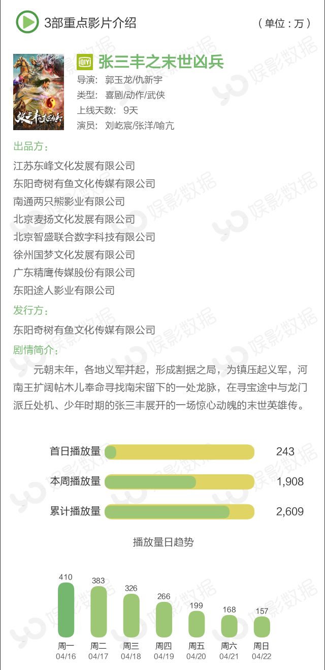 本周冠亚军影片《张三丰之末世凶兵》上线9天,本周播放量1908万,累计播放量2609万。同样来自爱奇艺平台的新片《杀出太平镇》上线5天,以782万播放量获得季军。
