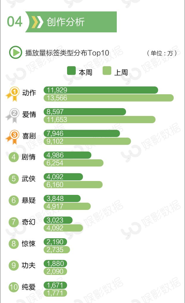 娱影君推测,本周播放量下降的主要原因是本周新片数量较上周减少9部,新片播放量有所较上周有所下降。