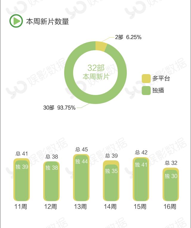 本周上新影片数32部新片,较上周减少9部,其中30部为独播片,仍占主流。