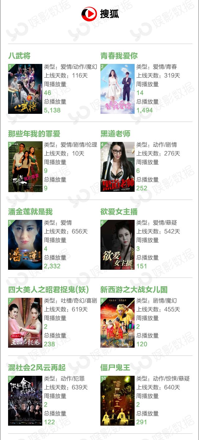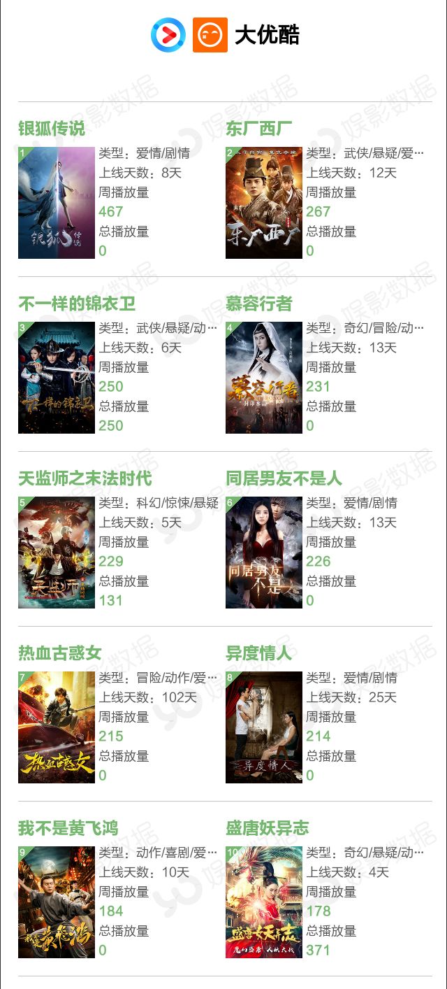 本周排名前十的网大中,有8部是在爱奇艺独播,优酷1部,腾讯1部。