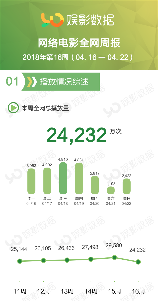 2018年第十六周(4月16日至4月22日)网络电影的全网播放量2.42亿次,较上周下降18.1%。其中周三(4月18日)播放量最高,达4910万。周六(4月21日)播放量最低,为1198万。