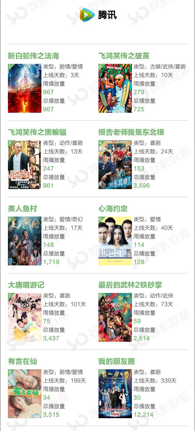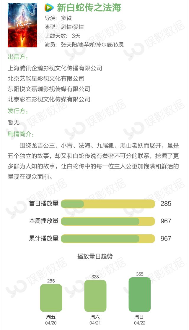 本周腾讯视频表现不俗,《新白蛇传之法海》上榜3天,以967万次播放量获得亚军。