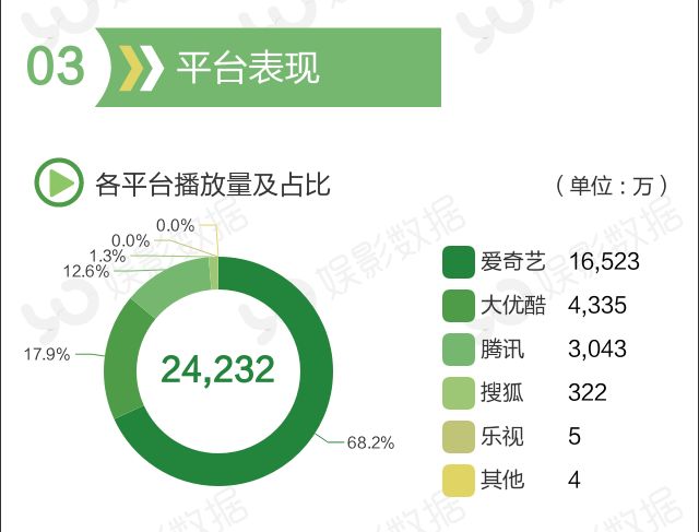 本周播放量排名前三的平台依然是爱奇艺、大优酷、腾讯。其中,爱奇艺播放量占比68.2%,较上周份额上升4.3%;大优酷占比下降6.2%,占比17.9%;腾讯第三,占比12.6,上升2.4%。