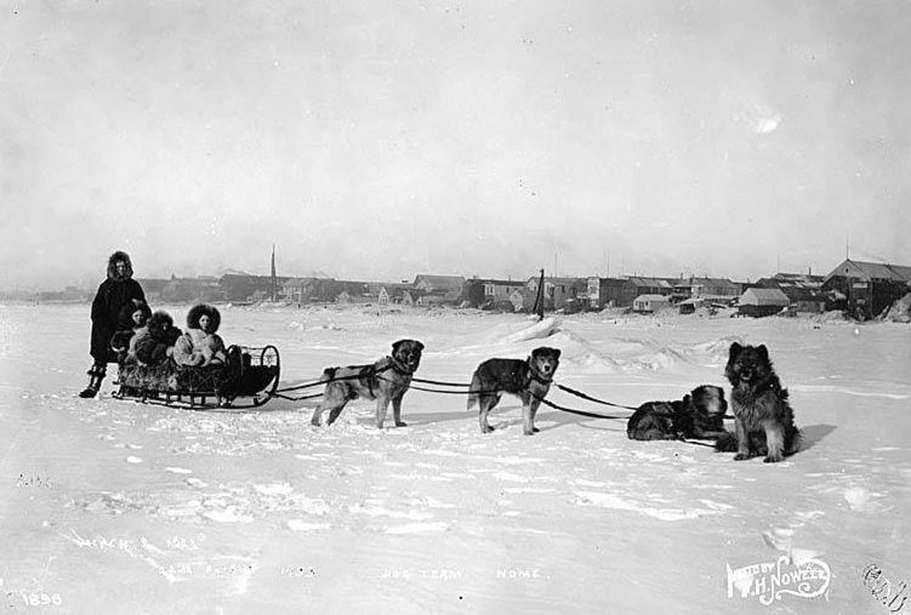 【图1】在远离美国本土的阿拉斯加州,有一座叫做诺姆(nome)的小镇。它位于北极圈以南大约2度的位置。在19世纪末,阿拉斯加掀起了一股淘金热,诺姆镇的居民一度超过了2万人。随着淘金热的消散,诺姆镇的人口也随之骤然减少。但到1925年,它仍然是阿拉斯加北部最大的城镇,总人口大约1430人,其中包括455名阿拉斯加原住民和975名欧洲后裔。图为20世纪初的诺姆镇街头。