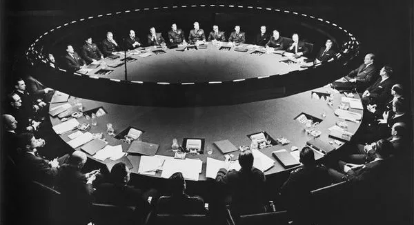 从纳粹疯狂科学家洗白成为美国核武器战争的负责人,冷战的技术顾问,奇爱博士出席着军事会议,游走在这些要员之中。
