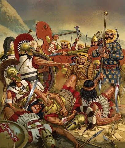他们的武器一般是长枪,也可能使用比较短的希腊短剑盛装出战,否则他们很难扛过重步兵方阵间的高强度对抗,更不提波斯人的漫天箭雨了。