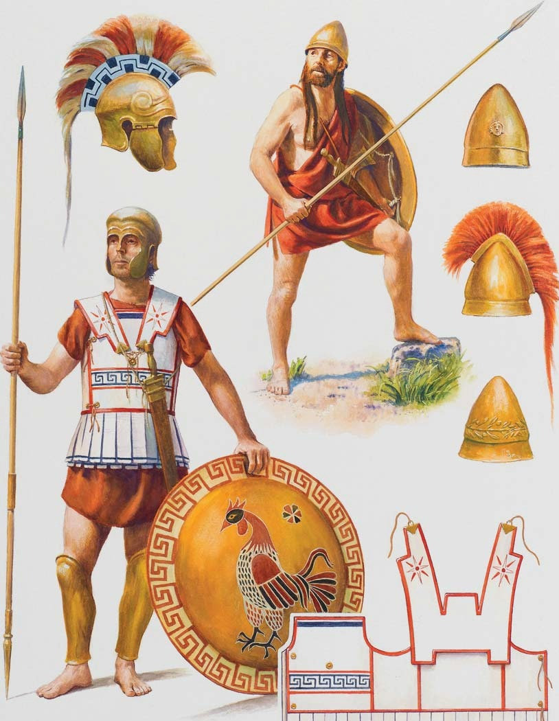 历史上的斯巴达武士绝对会穿戴全套重步兵装备:戴着科林斯式或者卡尔西顿式头盔,手持大圆盾牌,身着钟罩式金属胸甲或者亚麻质地的胸甲,以及金属质地的护胫甲。