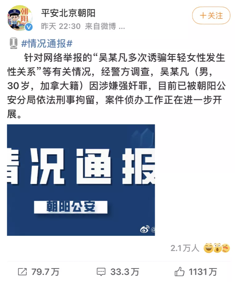 而且事态持续发酵,北京朝阳区公安还发布了吴某已被关进监狱的消息。