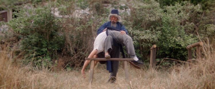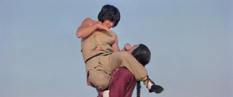 白长天在简福后面,利用竹竿和身体,通过步伐,造成了简福巧合打败敌人的效果。这段打戏拍的妙趣横生,设计之精妙,就算放在现在都不过时