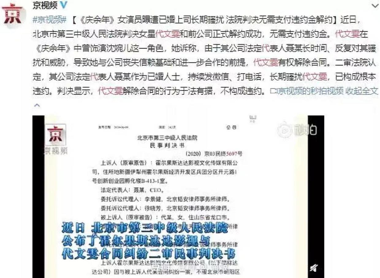 无奈之下,她提出解约,但是公司却说她违约,要求她支付给公司各种费用。在这种不合理的要求下,代文雯只好把公司告上法庭,维护自身权益。