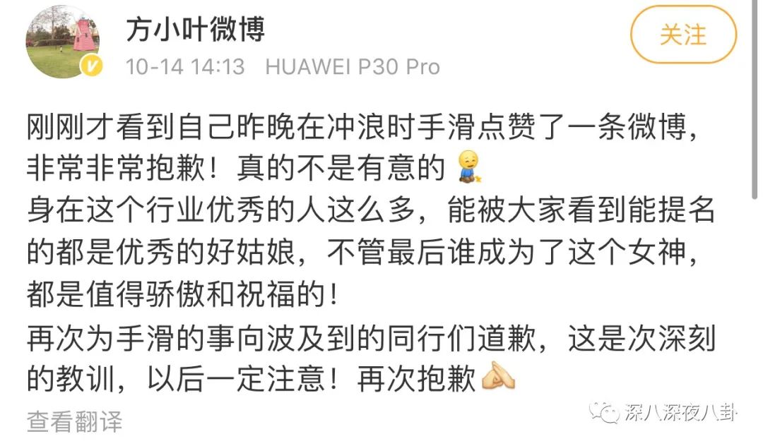 而昨天恰巧是金鹰女神投票的最后一天,谭松韵的经纪人方小叶前一天晚上点赞了一条diss宋茜的微博。