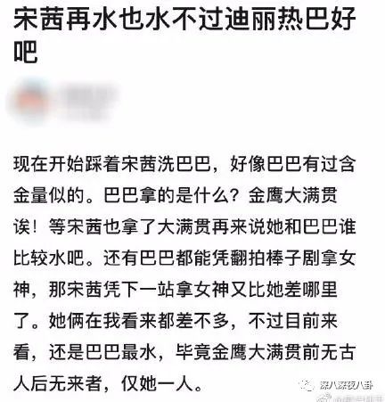 新一届金鹰女神揭晓后,大家开始讨论近两届女神谁更水,又演变成宋茜热巴两家的battle。互相甩实绩这些都是常规操作了