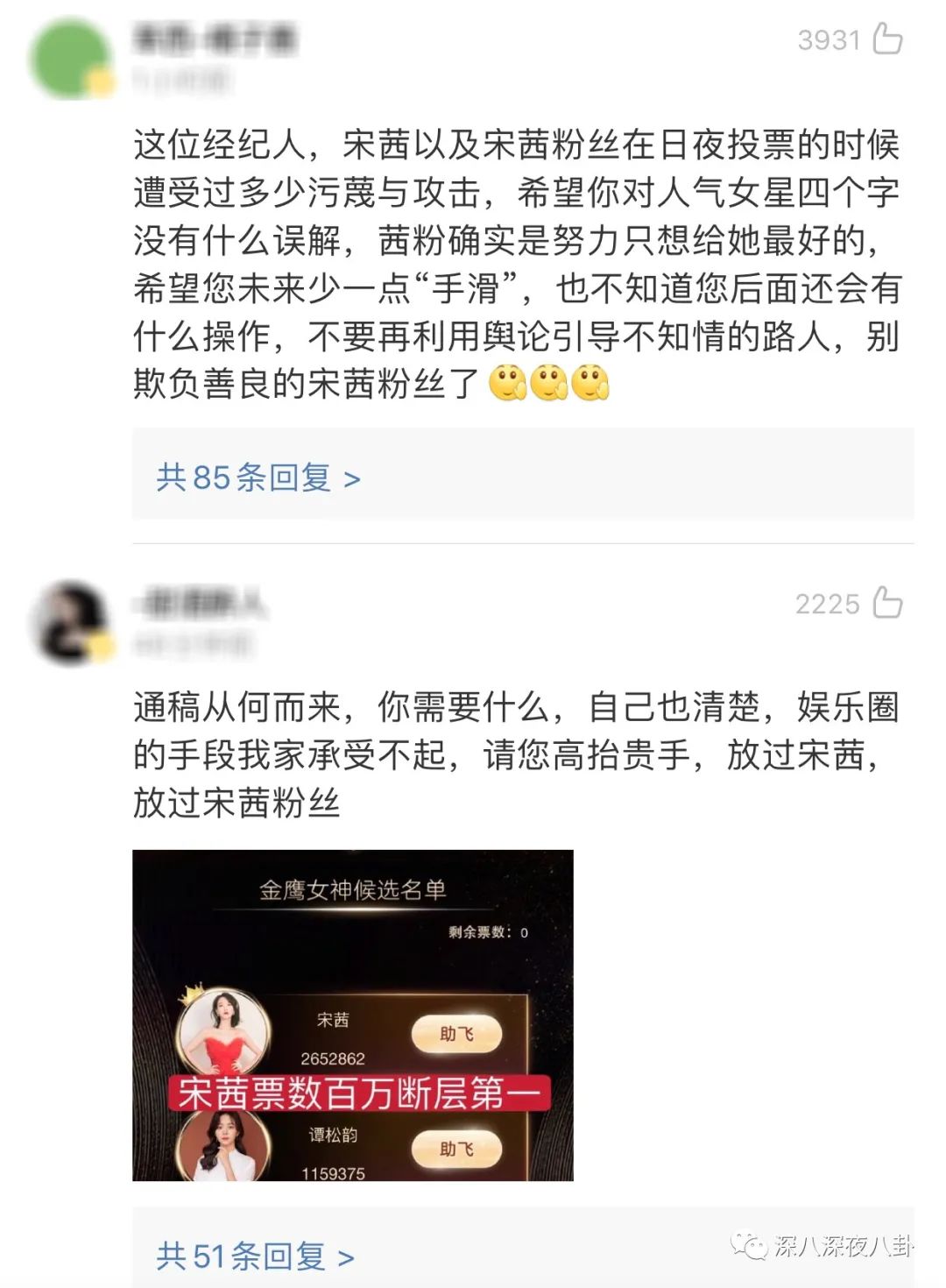 “谭松韵家一直吹嘘自己百万路人缘,到投票见真章,宋茜的票数都是茜粉一个个投出来的,断层第一值得”,还作诗“金鹰飞空时 地上酸鸡至”来酸对方;