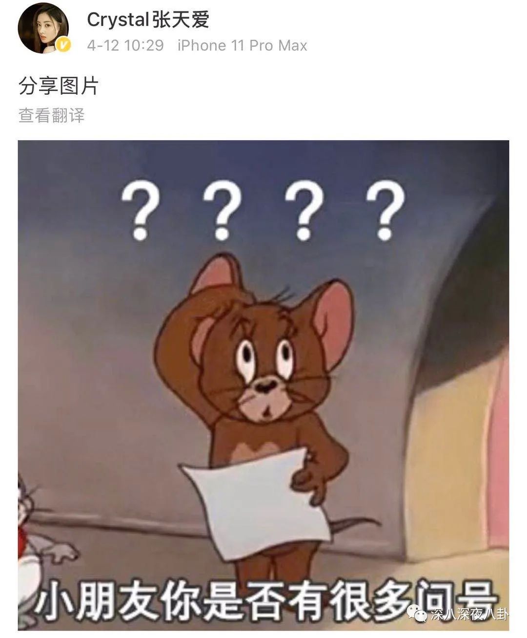 张天爱本人在微博发问号,一个表情包就把问题解决了。