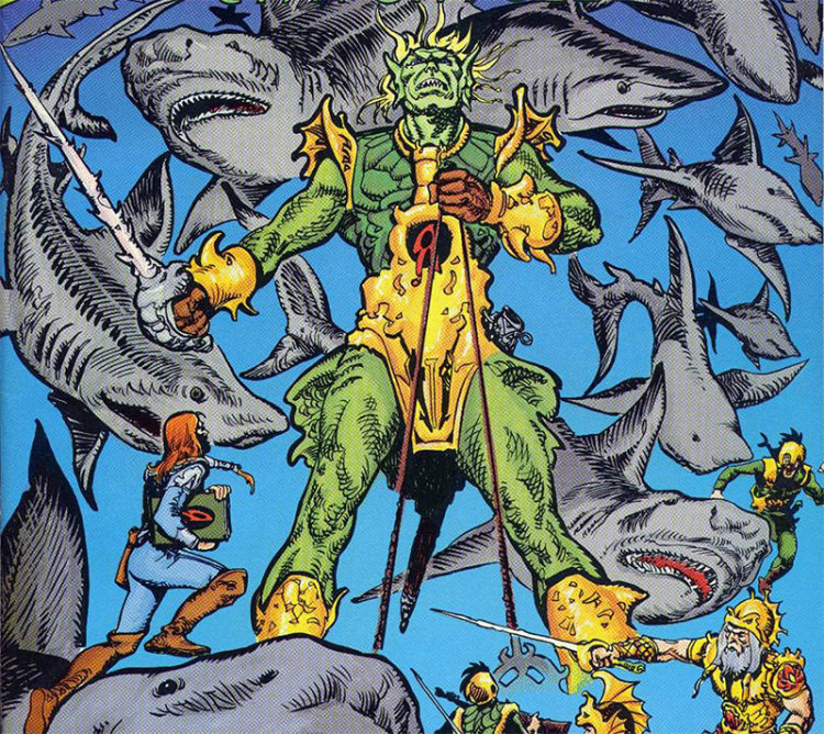 海洋女王:本名亚特兰娜,1978年遇到了托马斯·库里,两人相爱并诞下一子。但是这为神界所不允许,为了保护丈夫和孩子,她重回海洋打算独自接受惩罚,临走前把自己的五叉戟留给海王。