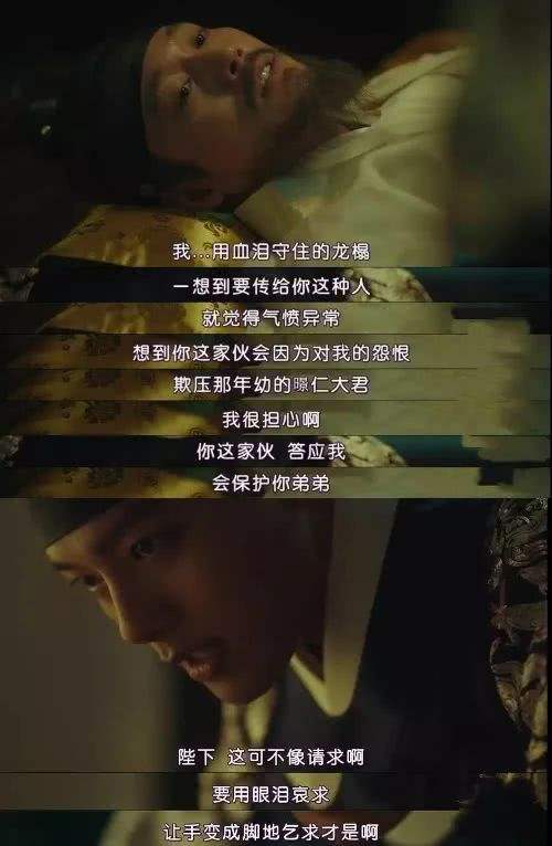 先王卧榻,临终唤他上前有要事嘱托,光海一脸恭顺,面对父亲临终嘱托时,他并没有展现出丝毫的怜悯,反而暴露出了自己的真面目,“陛下这可不像请求啊,要用眼泪哀求,让手变成脚哀求才是啊。”转眼抬头含泪,眼神坚定。