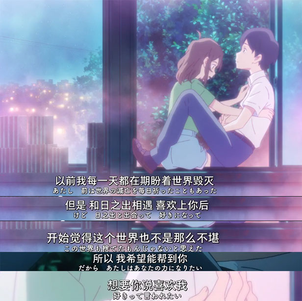 电影主打治愈与爱情两个主题,讲述的是“问题少女”无限从逃避生活到走出孤独获得新生与成长的故事。延续一贯风格,冈妈对少女陷入恋爱、逃避生活与希望世界毁灭等感情处理,刻画都十分细腻。