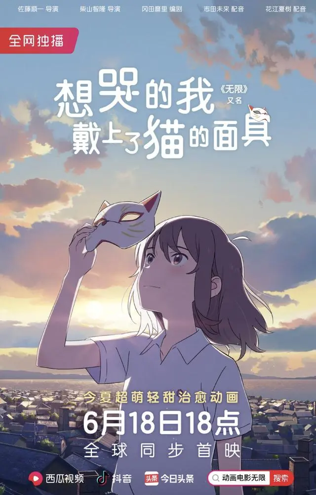 由netflx发行的治愈系动画《无限》又名《想哭的我戴上了猫的面具》已于6月18日全球同步上线。由于新冠疫情原因该影片无法在电影院中正常上映,于是我们财大气粗的字节跳动再次买下了《无限》在国内的独家播放权。各位小伙伴可以在西瓜视频与抖音上,看到这部由冈田麿里打造的治愈片。