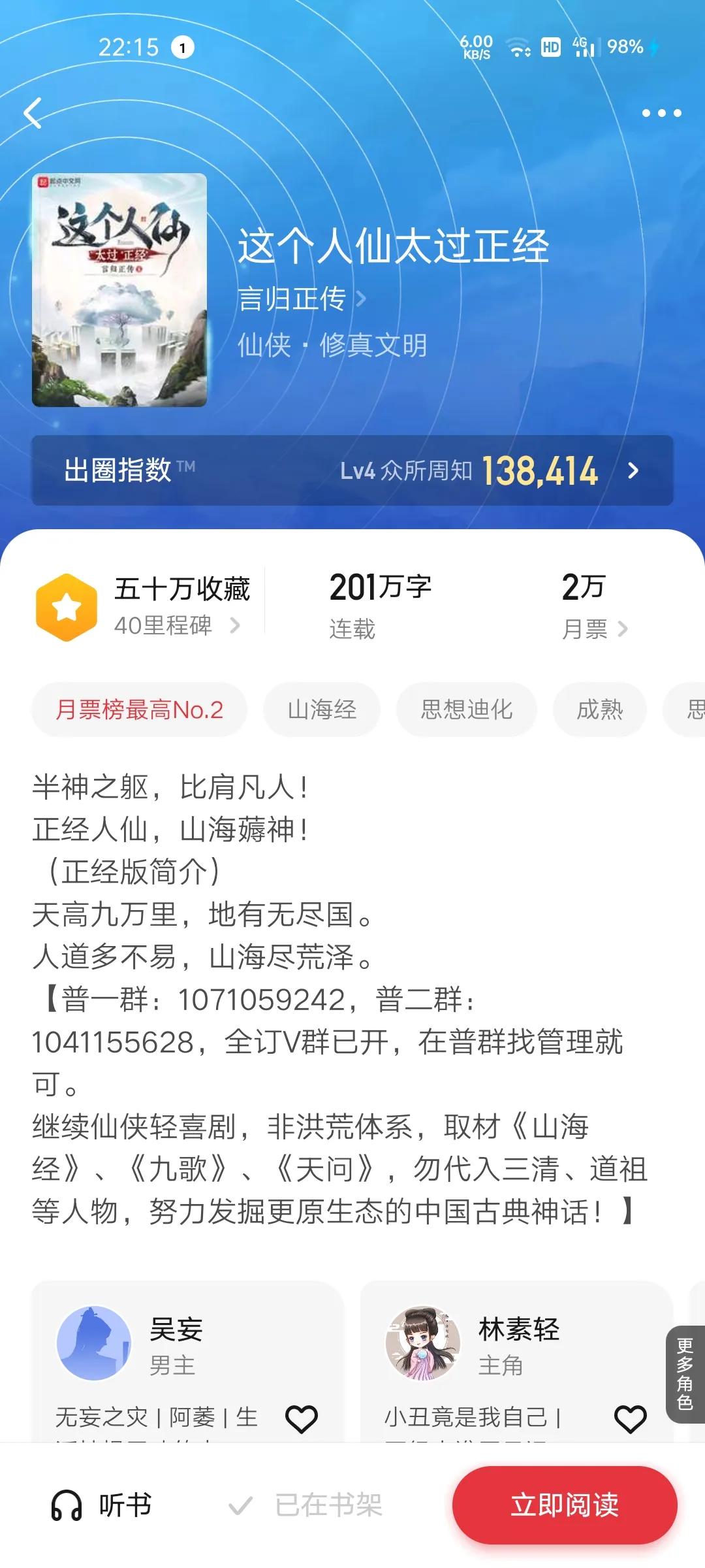 5.这个人仙不太正经(言归正传)新书上架月票155710首订4.2万,均订3.8万,200万日更也是逼近1万,吴妄是未来的东皇太一,目前正在天庭挖墙角,与少司命谈恋爱,手握星辰大道,继承伏羲大道,母亲远古冰神,实力很强,人物神农与帝竣的战斗,烛龙与三方的矛盾看吴妄成为东皇太一。
