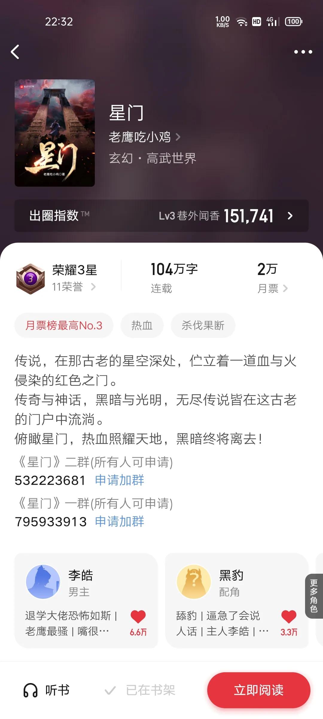 3.星门(老鹰吃小鸡)上架月票75724,首订5.2万目前均订3.6万,103万52天更新就是牛逼。九月正在争月票第一,3.6万对抗10万均订,日更3万看的很爽,李皓目前斗千斩杀三阳,接下来实力又将提升,尽管是高武后转但是不影响剧情,高武的人王只是提到,可能后期才会出现,八大家的秘密,武道成长的道路,一切都在星门中。