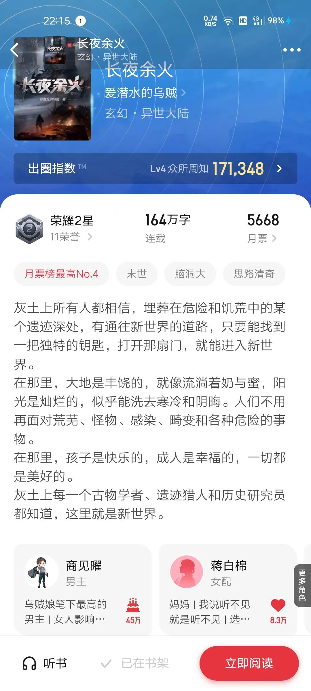 4.长夜余火(爱潜水的乌贼)新书上架月票83809首订5.1万开启首订5万的潮流,创新型作者,没本书都在挑战自己,163万更新稳定,值得一看,看商见曜探索末日废土,致新世界呼唤新生。