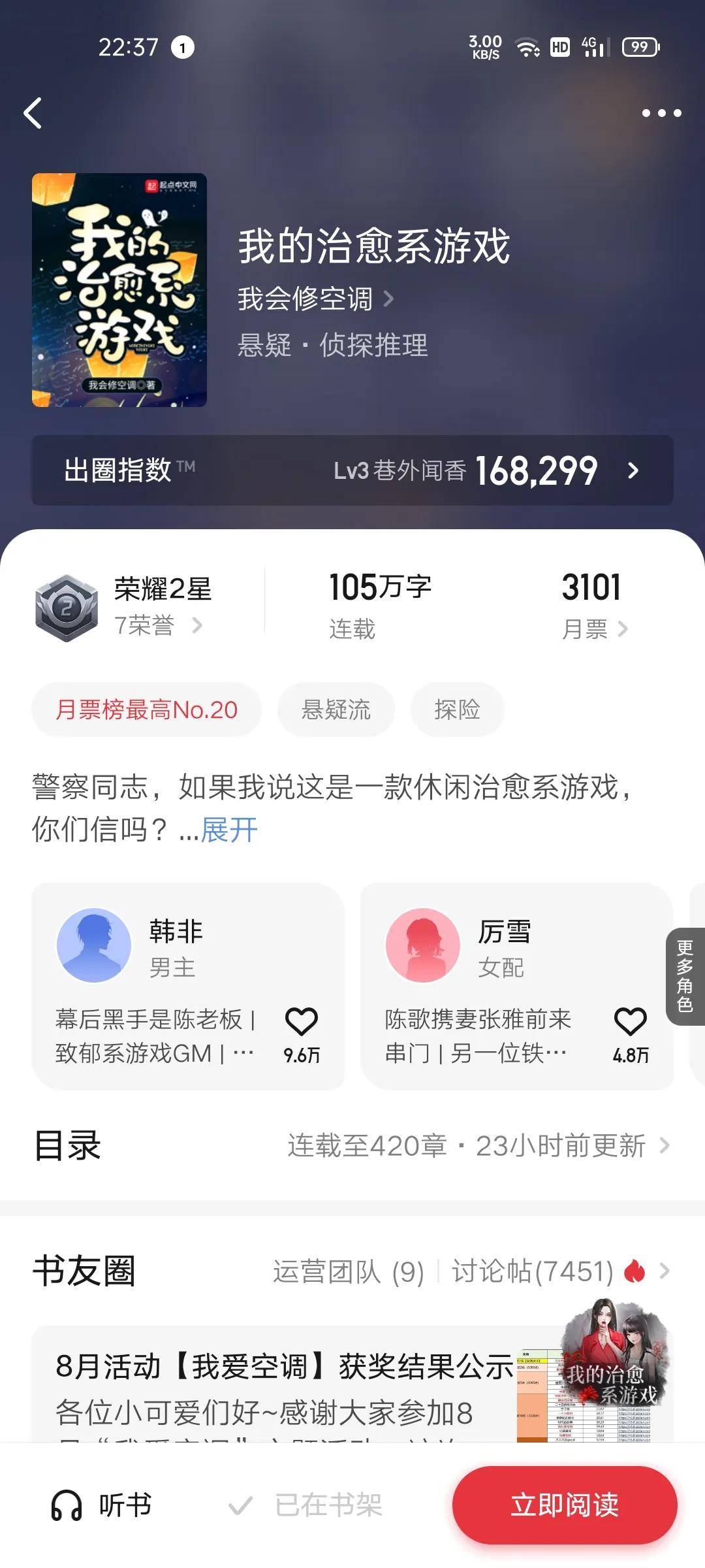 9.我的治愈系游戏(我会修空调)新书月票21346首订1.8万均订3.8万大神的实力还是挺稳的105万字可以看几天的,更新有点让人无语,悬疑的作品更新有情可原,蝴蝶现实中杀人,韩非游戏中破案,拯救鬼,救赎人间还是挺惊悚的搞笑的。