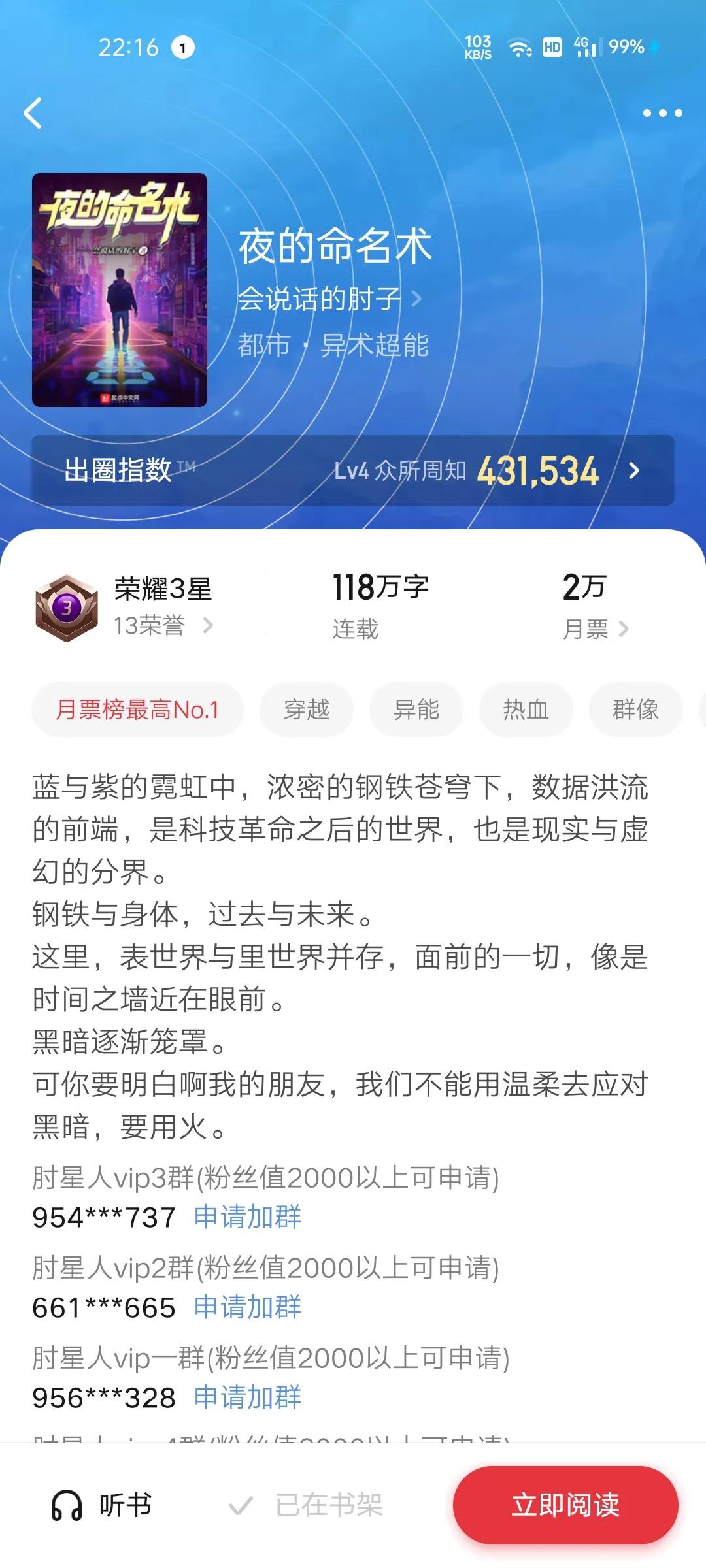 2.夜的命名术(爱说话的肘子)新书上架月票上架162126首订6.2万,目前均订9.8万即将再入十万俱乐部,117万可以看了,成为史上最快进入十万均订的小说,起点的亲儿子活动拉满。与前两本书联系很大,表世界,里世界7天一穿越。
