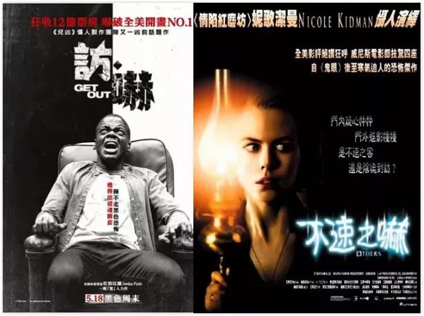 而去年年度政治最正确电影《逃出绝命镇》,港译名《访·吓》。初看上去不明就里。「吓」在粤语里与「客」同音。一作访客,二有惊悚片性质。