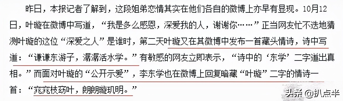 情到浓时,据说两人还在社交平台上大玩藏头诗表白对方,叶璇写:“谦谦东游子,潺潺活水学。” 李东学回:“窕窕枝窈叶,朗朗璇玑明。”