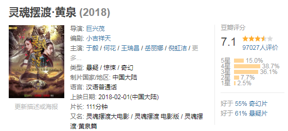 但也不能一棍子打死所有的网大电影,偶尔也能出一两部能看、耐看的类型,比如《灵魂摆渡之黄泉》就曾拿到了豆瓣7.1的“高分”,对于网大来说这的确算得上是一个不错的分数。