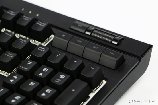 键盘右上角相比上一代惩戒者增加了多媒体功能按键,支持视频和音频的播放暂停切换灯光功能,控制音量的无极滚轮是从k系列移植过来的,多媒体按键区域同样支持rgb光效。