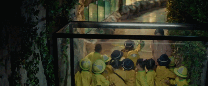 先是远远地站在队伍的最尾,再趁老师不注意绕到橱窗的背面。