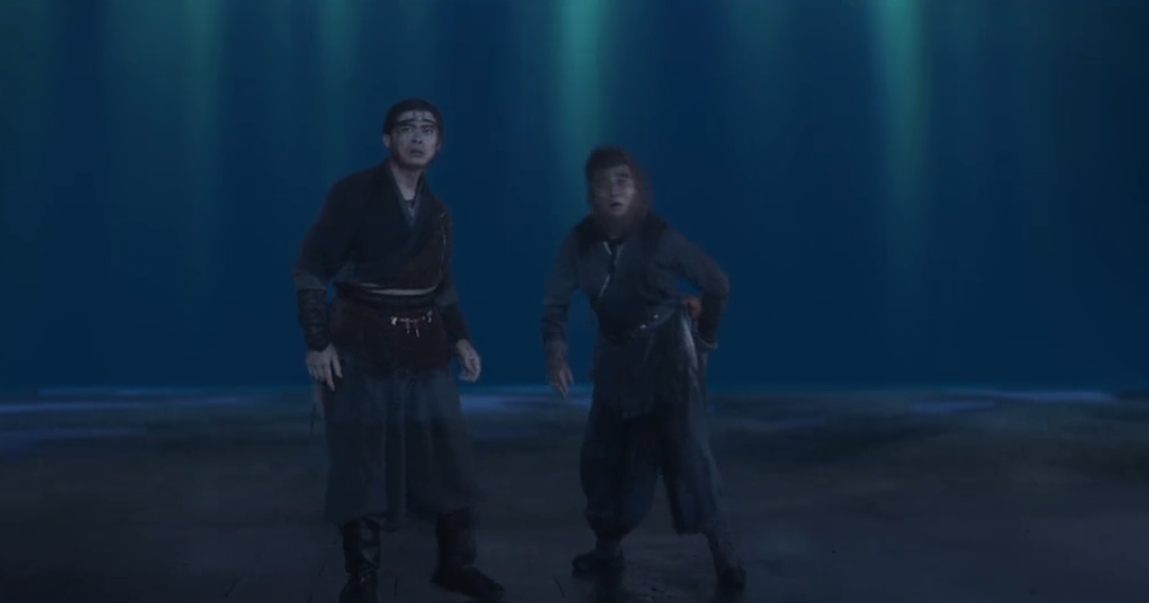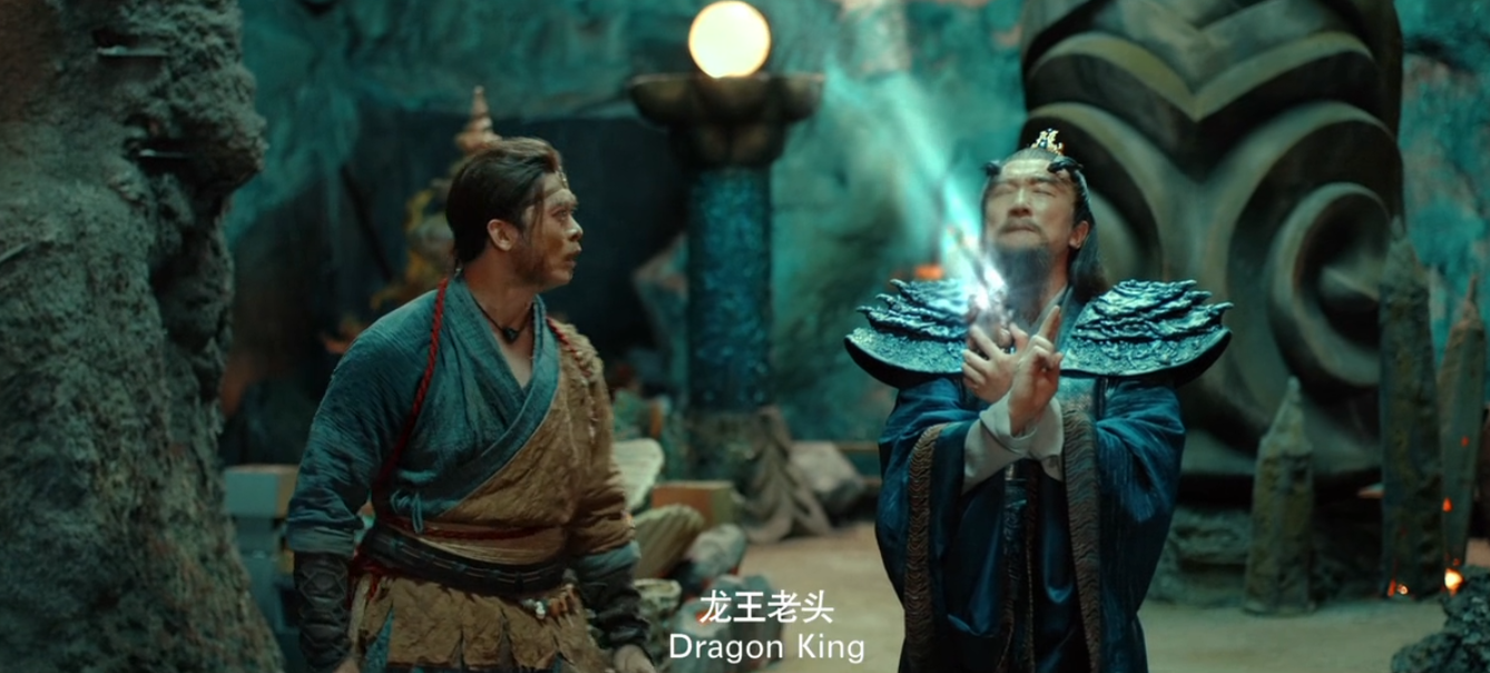 九公主带孙悟空来到定海神针前,让他拔出定海神针,这惊动了敖栾,他化成龙王的样子前来查看,九公主逃跑,敖栾欺骗说九公主是妖女,孙悟空只想要雨,敖栾便施法下起了雨。