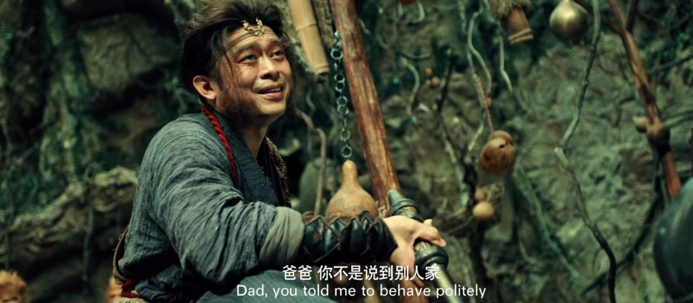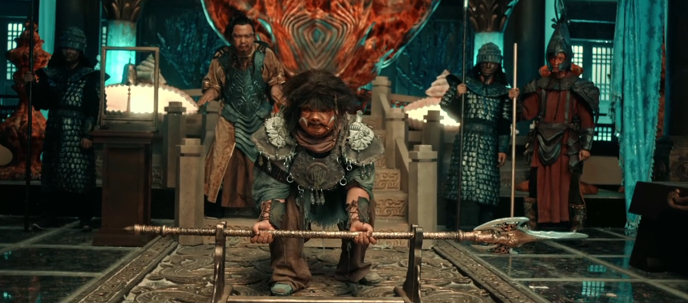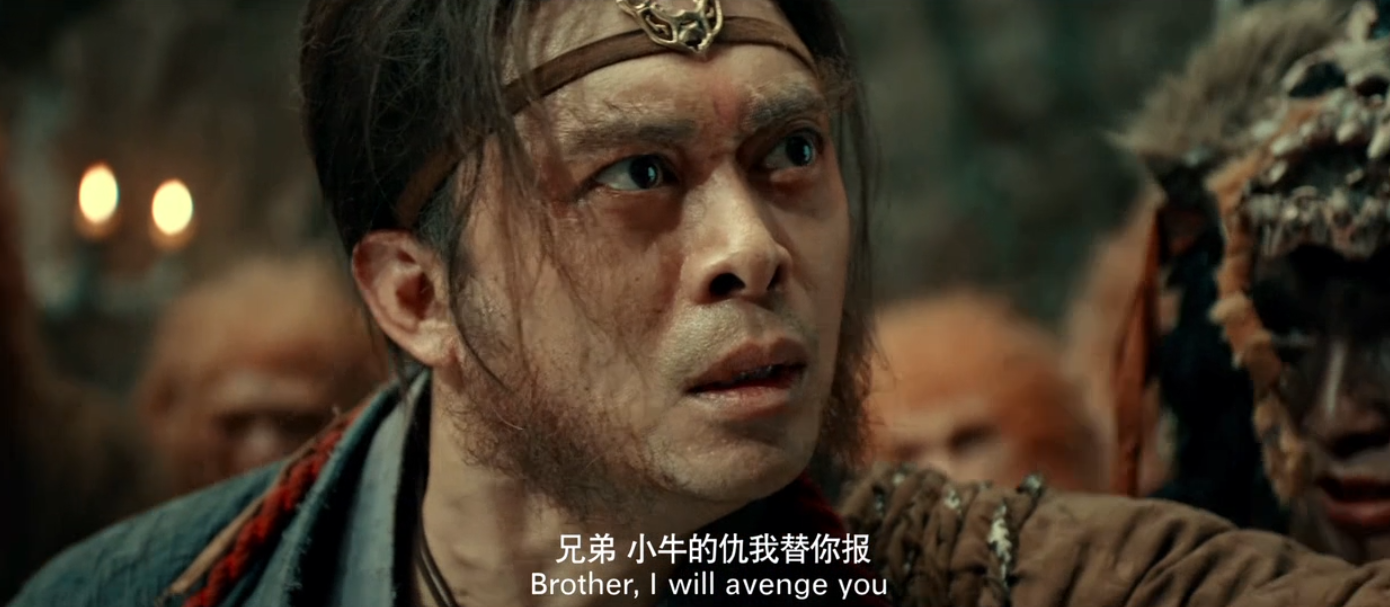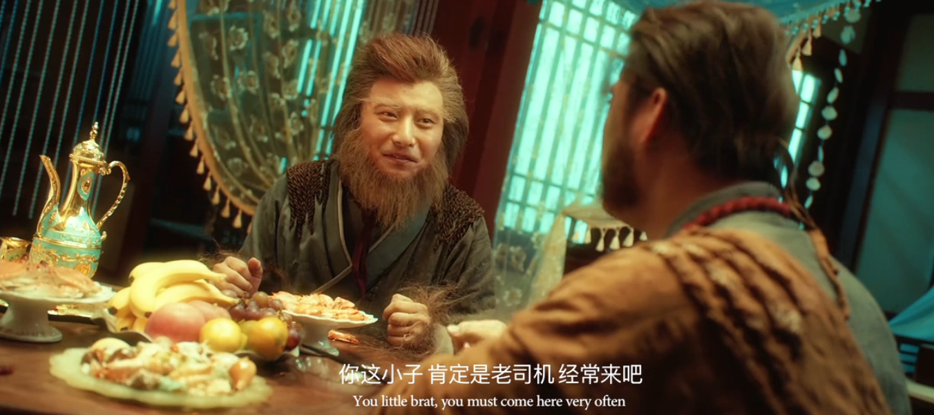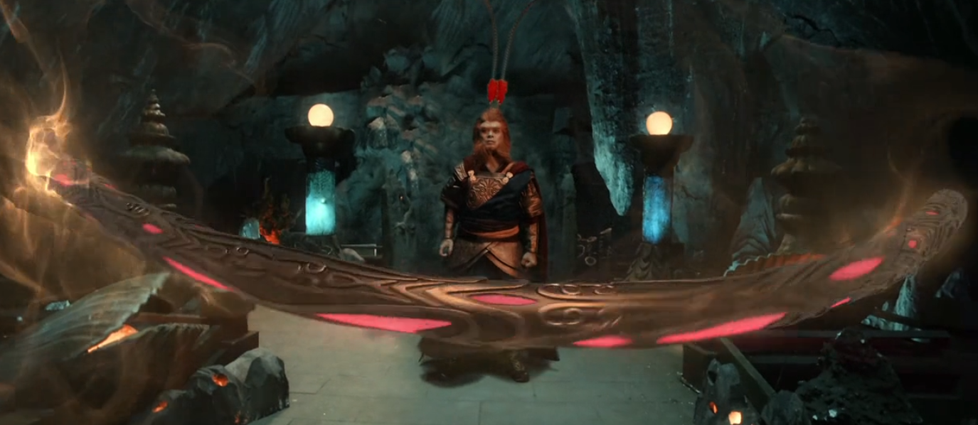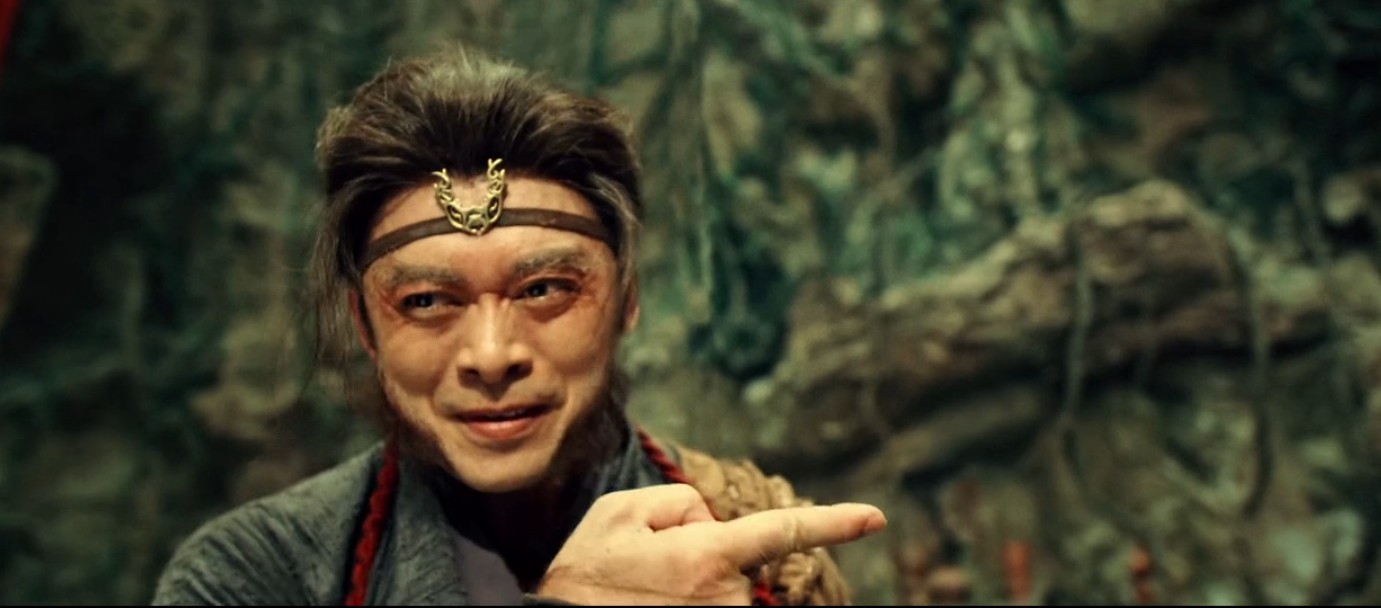 影片一开始就是牛魔王来到猴山找孙悟空借水,别的不说,先看看这副装扮,好歹上边那个还能看出来是牛魔王,下边这个分明就是个人,哪里像猴子了?