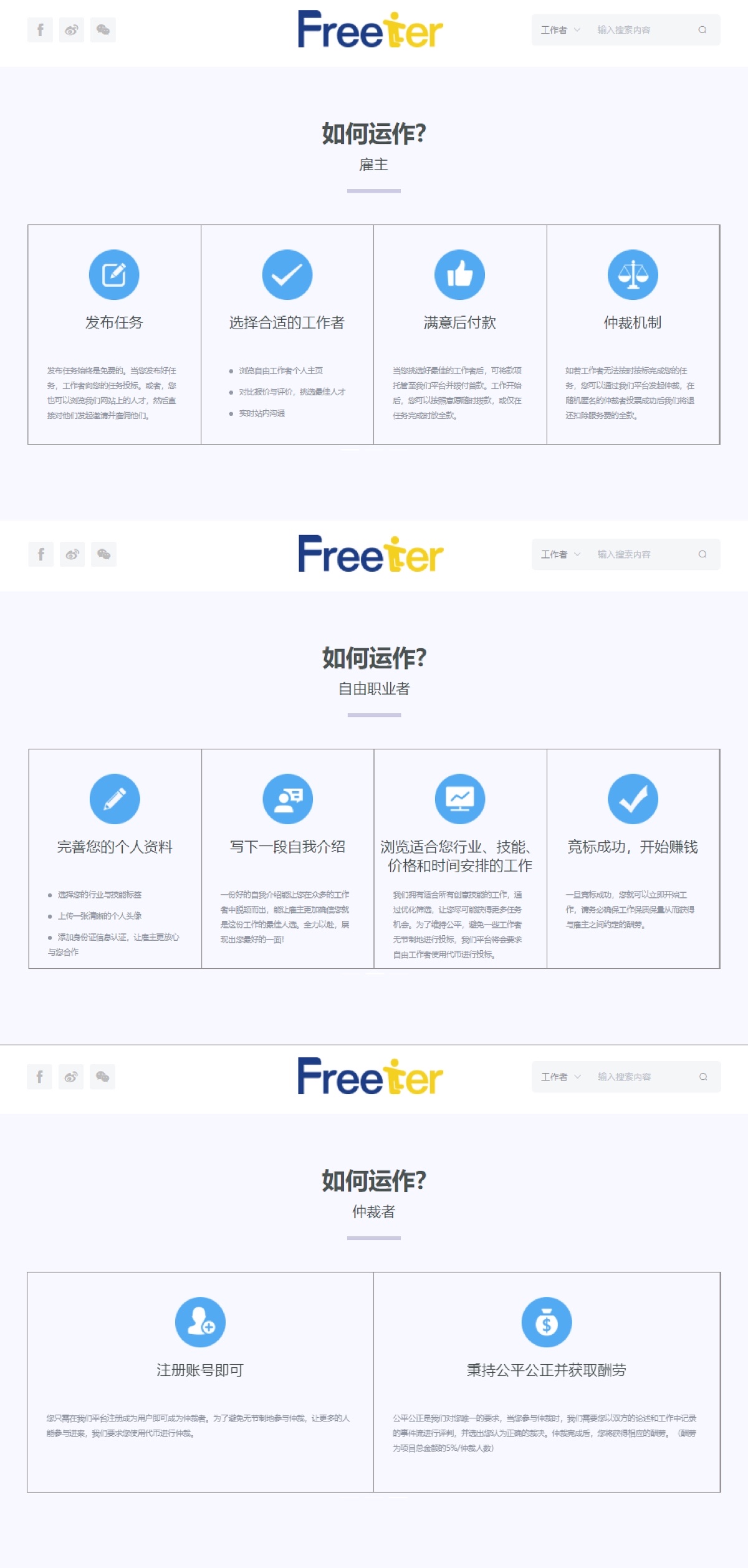 大部分自由职业者依托社交媒体平台工作,也就是说平台化的媒介模式、平台化的企业形式成为自由职业者工作的工具和工作的方式。 比如freeter-创意自由职业平台,分雇主、自由职业者和仲裁者三种运作方式,能同时满足你聘用和就业两种需求并保障你的工作权益。