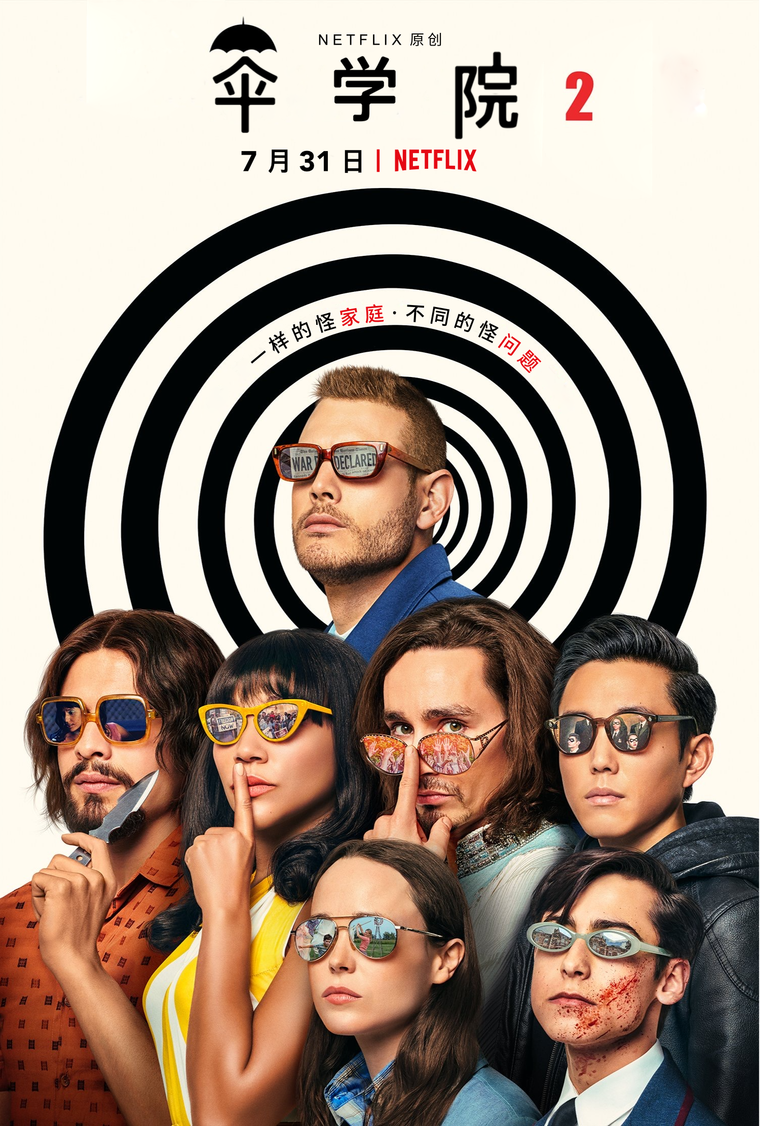 第二季故事紧接上一季。5娃也不知道自己究竟把大家传送到哪里了,原来都到了得克赛斯州达拉斯,只不过“年份”有出入。先是能和亡灵沟通的4娃克劳斯与已经是亡灵的6娃本被传到1960年;有“言说入脑”能力的3娃艾莉森到了1961年;猩猩体格的大娃卢瑟到了1962年;“小李飞刀”2娃迪亚哥到了1963年9月1日;能量爆表的7娃凡妮娅到了1963年10月12日;5娃自己到了1963年11月25日。
