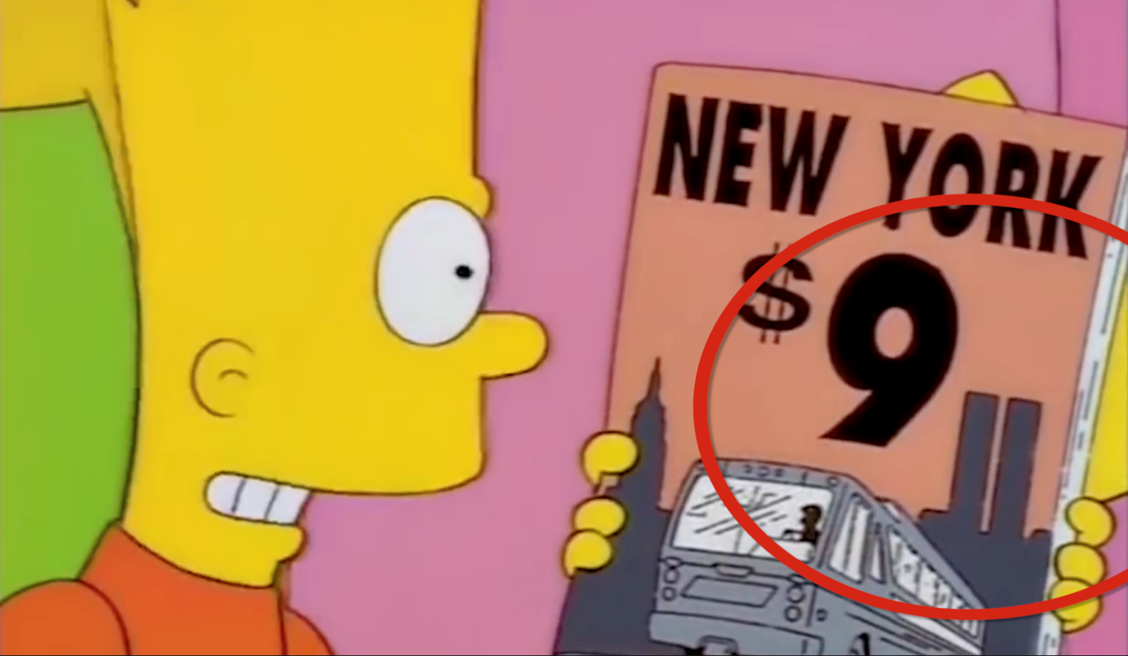 辛普森1997年播出的一集动画中,提到了双子星大楼,在画面中人物拿着一个本子,本子的封面就是远处的双子星大楼,然而,令人毛骨悚然的是,在双子星大楼旁边,写着一个大大的数字9!这里的9美元实际上是巴士的车票价格。