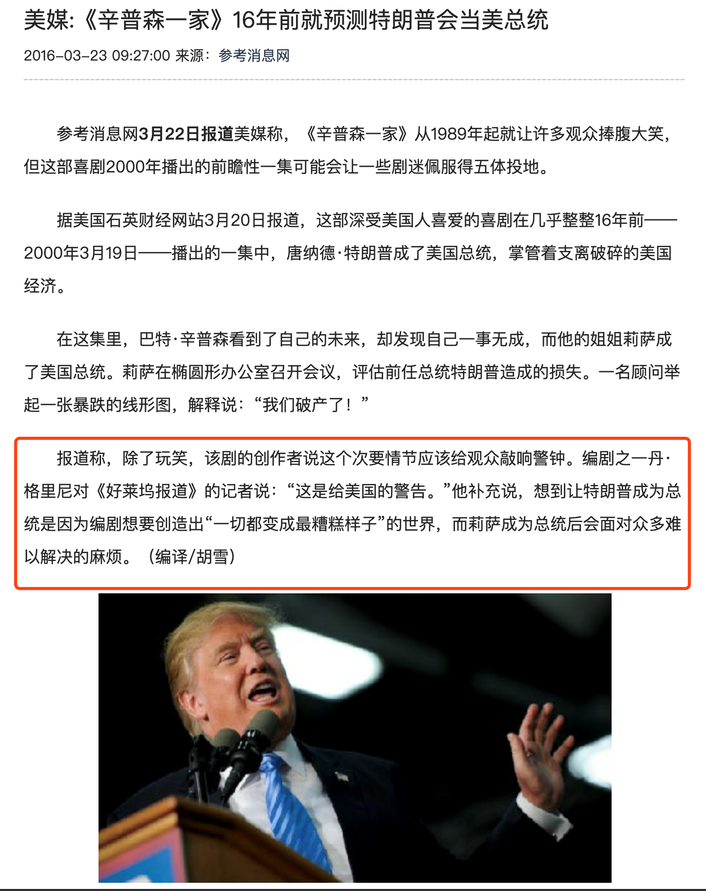 讽刺的是,该剧创作人之一的格里尼(dan greaney),几年前,在接受采访时曾表示,在节目内加入特朗普,为的是警告美国人,特朗普一旦上台,后果将难以想象。